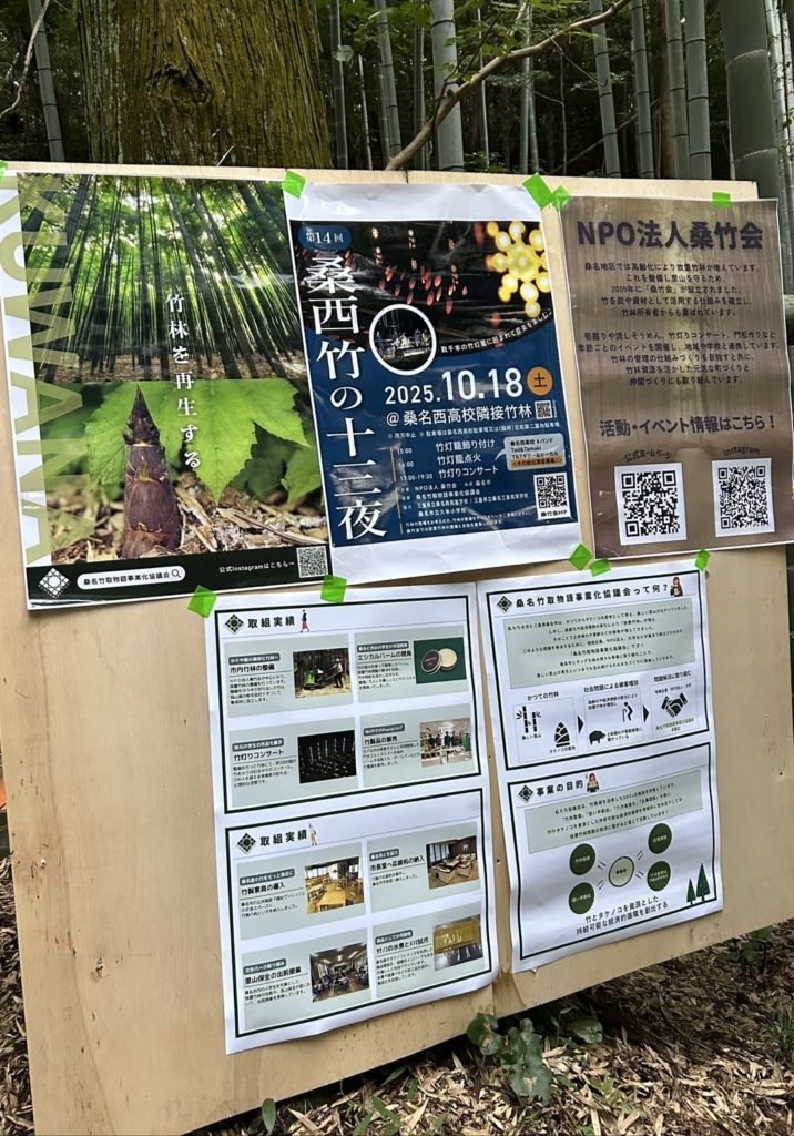 桑竹会さんや桑名竹取物語事業化協議会さんの基で。桑名の竹林、9割が放置竹林。その活用や地域活性化に取り組まれています。